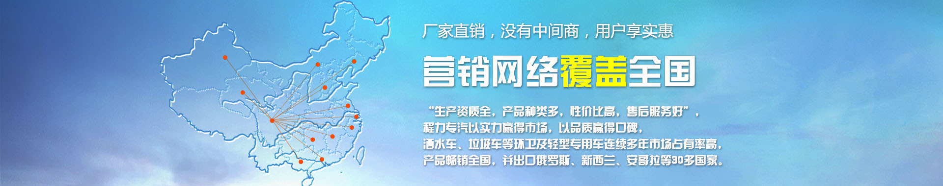 我公司致力于開發(fā)生產(chǎn)銷售專用汽車為已任,為您量身打造方便實(shí)用,耐用的專用汽車,其主導(dǎo)品種有園林綠化灑水車、環(huán)衛(wèi)灑水車、油罐加運(yùn)油車、吸糞車、吸污車、擺臂、掛桶、密封式垃圾車、廂式運(yùn)輸車、消防車、半掛車、自卸車、水泥車、隨車吊等八大系列100多個(gè)品種300多個(gè)車型。同時(shí)批發(fā)東風(fēng)、解放、福田等各種二類底盤。目前我公司銷售網(wǎng)絡(luò)基本已覆蓋全國(guó)各地,具體如下。
